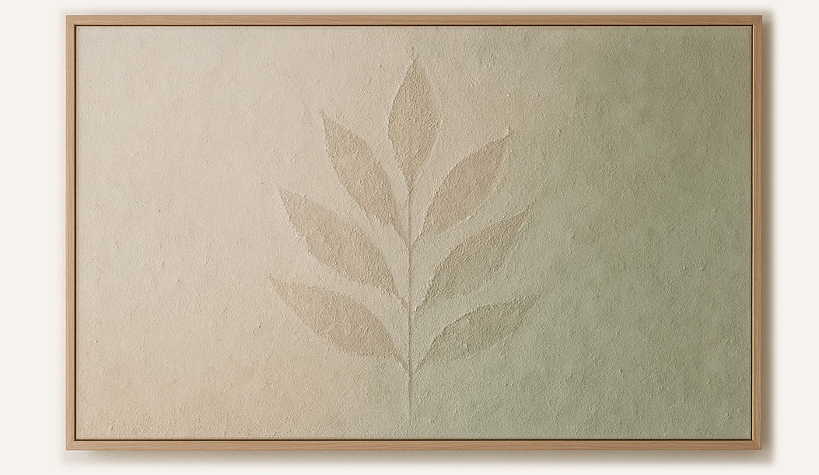 Degradados suaves en beige, verde seco y blanco con una hoja bajo la arena. Transmite naturalidad y conexión con la tierra.