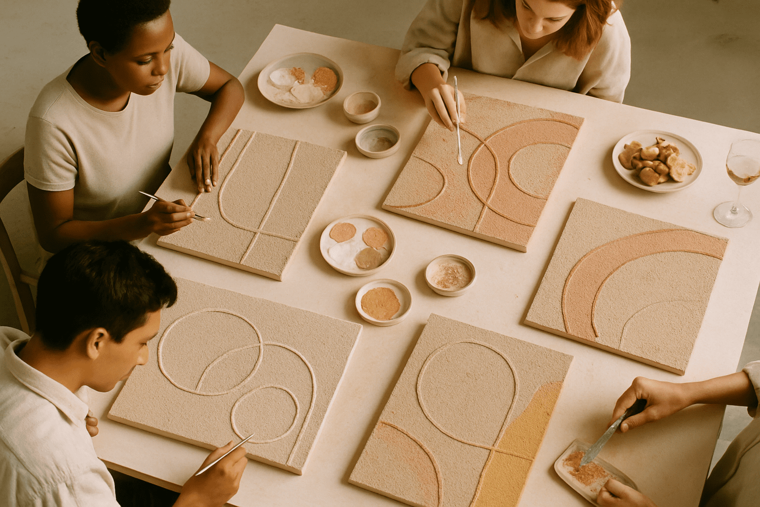 Durante esta experiencia, crearás una obra abstracta con volumen y textura utilizando cuerdas para formar figuras geométricas —líneas, arcos, curvas o círculos— que luego pintarás con una paleta de colores suaves y tonos tierra.